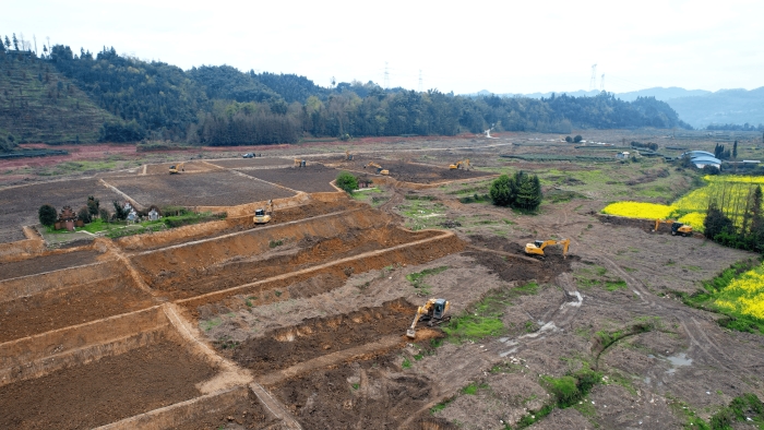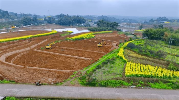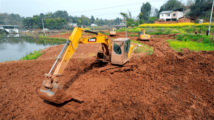 洪雅向東90公里,是仁壽縣,作為四川省產(chǎn)糧大縣,仁壽曾因田塊細碎導(dǎo)致機械化率不足。在5000畝的高標(biāo)準(zhǔn)農(nóng)田建設(shè)中,項目方集結(jié)18臺徐工挖掘機,以“日均30多畝”的速度搶抓工期。