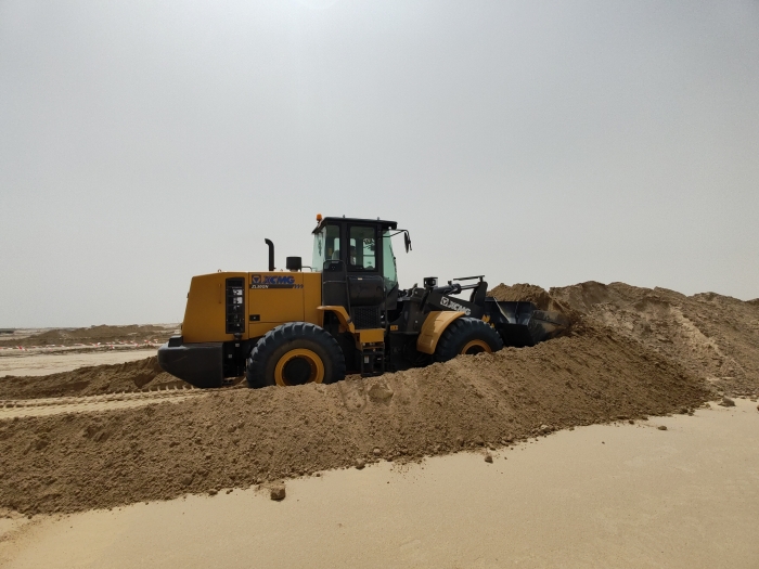 當(dāng)?shù)亟鸸忾W耀的沙漠地帶是極具標(biāo)志性的景觀,數(shù)臺(tái)徐工ZL50GN裝載機(jī)正在其中緊張作業(yè)。擔(dān)負(fù)起土方搬運(yùn)、路基平整、材料裝卸等關(guān)鍵任務(wù),在高溫、多塵的惡劣環(huán)境下依然表現(xiàn)出眾,成為不可或缺的重要力量。