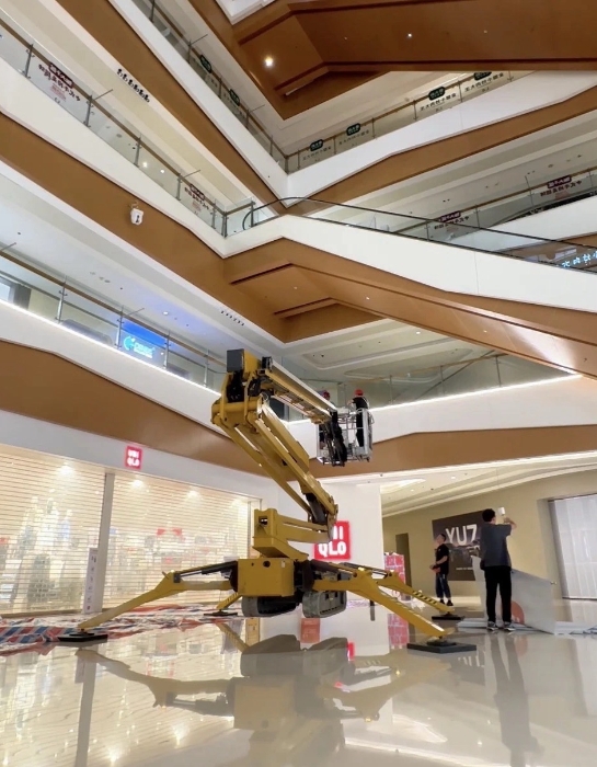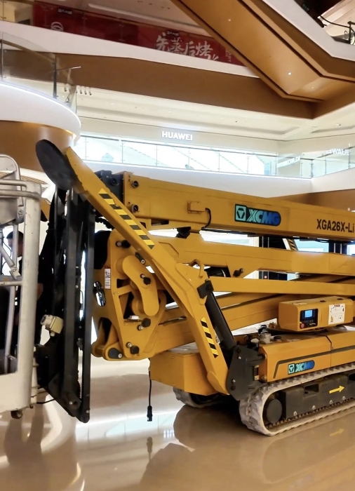 在杭州某大型商場(chǎng),徐工XGS26X-Li將四只“蜘蛛腿”穩(wěn)穩(wěn)“扎根”在商場(chǎng)中庭,正在向玻璃圍欄下方的墻壁伸展臂架。超窄車身“溜”進(jìn)商場(chǎng)、伸縮臂架“瞄”準(zhǔn)墻面,這是徐工蜘蛛車在商場(chǎng)進(jìn)行維修保養(yǎng)的日常。而看似日常的施工,需要面對(duì)三關(guān)“難題”。