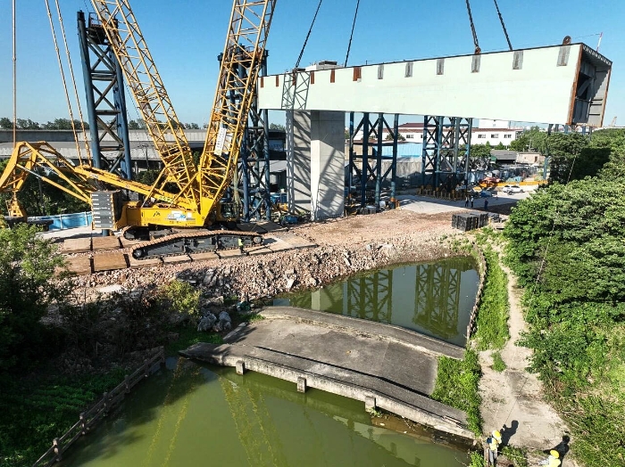 此次吊裝任務面臨嚴峻挑戰(zhàn):施工區(qū)域一側(cè)緊鄰湖泊,一側(cè)倚靠橋梁鋼立柱,周邊更有林木環(huán)繞,設備回轉(zhuǎn)半徑嚴重受限,空間調(diào)度堪稱“毫米級”較量。