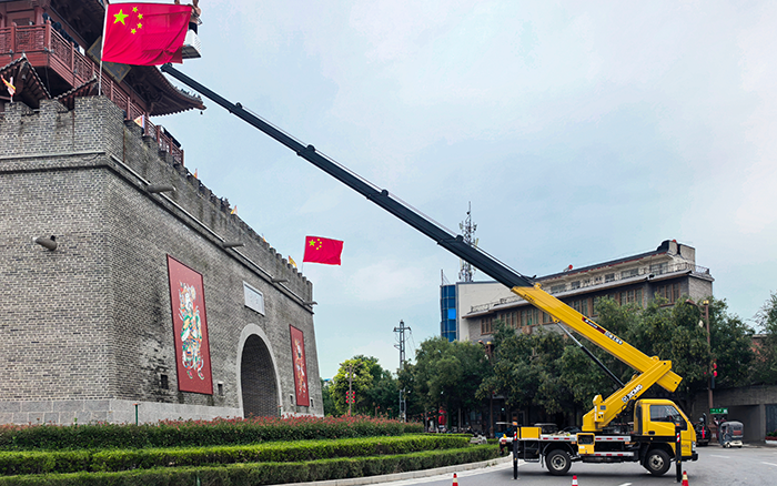 文昌閣前,一抹抹 “中國紅” 悄然升起。徐工 M 系列 GKS32 高空作業(yè)車伸展長臂,穩(wěn)穩(wěn)將施工人員送達高空作業(yè)點。最大作業(yè)高度32 米,精準覆蓋建筑立面,轉臺 360° 連續(xù)回轉間,國旗已平穩(wěn)就位。