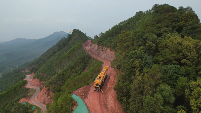 在廣西崇山峻嶺中,徐工XCA4000輪式起重機(jī)憑借“6+2雙動力”驅(qū)動系統(tǒng),以402.5噸整車重量完成重載轉(zhuǎn)場,在陡峭狹窄的山地中穩(wěn)健行進(jìn)。