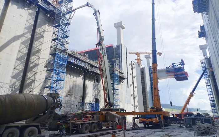 閘門立柱高聳入云,澆筑精度要求堪比“云端繡花”。徐工泵車、起重、塔機(jī)成套化裝備舉重若輕,天塹之間“穿針引線”!