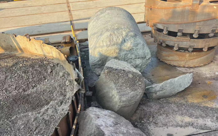 該橋主墩基礎(chǔ)共采用18根6.3米超大直徑鉆孔樁,這是目前國內(nèi)直徑最大鉆孔樁基礎(chǔ)。其樁深106米,水深66米,入巖40米,部分樁基最深達(dá)到116米。徐工XR1600E旋挖鉆機需要層層穿越強風(fēng)化花崗巖,弱風(fēng)化破碎花崗巖、碎裂巖、微風(fēng)化破碎流紋巖等復(fù)雜地層,在海底深處為大橋夯基。